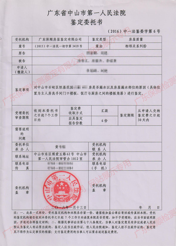 由中山市第一人民法院審理的原告李**、劉*與被告劉**、劉**、李**財產(chǎn)損害賠償糾紛一案,因案情需要,受中山市第一人民法院的委托,廣東保順檢測鑒定有限公司對中山市恒基花園*棟是否漏水以及漏水部位的原因進行鑒定。