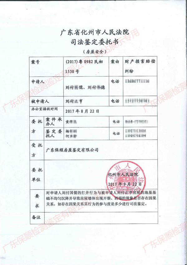 由廣東省化州市人民法院審理的原告劉付*亨與被告劉付*儒財產損害賠償糾紛一案,需要進行房屋鑒定,受廣東省化州市人民法院的委托,我司對被告的打井行為與原告房屋的地基基礎不均勻沉降并導致房屋墻體出現開裂、坍塌的現象是否存在因果關系進行房屋安全鑒定。