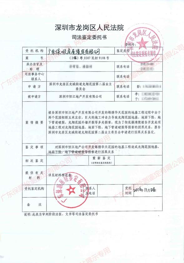 由深圳市龍崗區(qū)人民法院審理的深圳市龍崗區(qū)龍城街道龍翔花園第二屆業(yè)主委員會與深圳市恒江地產(chǎn)開發(fā)有限公司糾紛一案中,因案情需要,受深圳市龍崗區(qū)人民法院的委托,我司對深圳市恒江地產(chǎn)開發(fā)有限公司錦繡華天花園的地基工程與龍翔花園1棟5、6單元房屋上部結(jié)構(gòu)開裂的因果關(guān)系進(jìn)行房屋檢測鑒定。