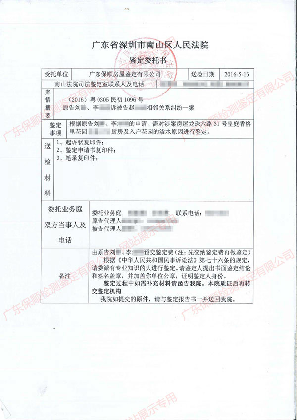 由廣東省深圳市南山區人民法院審理的原告劉*、李**訴被告趙**相鄰關系糾紛一案,需對涉案房屋廚房及入戶花園的滲水原因進行鑒定。