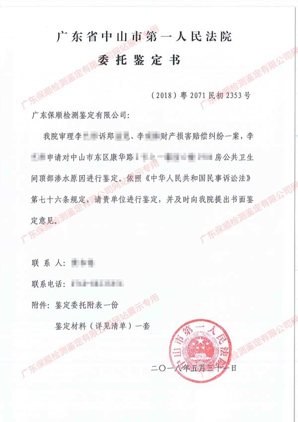 由廣東省中山市第一人民法院審理的原告李**與被告鄭**、李**財產(chǎn)損害賠償糾紛一案,因案情需要,廣東保順檢測鑒定有限公司對中山市東區(qū)康華路2號**房公共衛(wèi)生間頂部滲水原因進行鑒定。