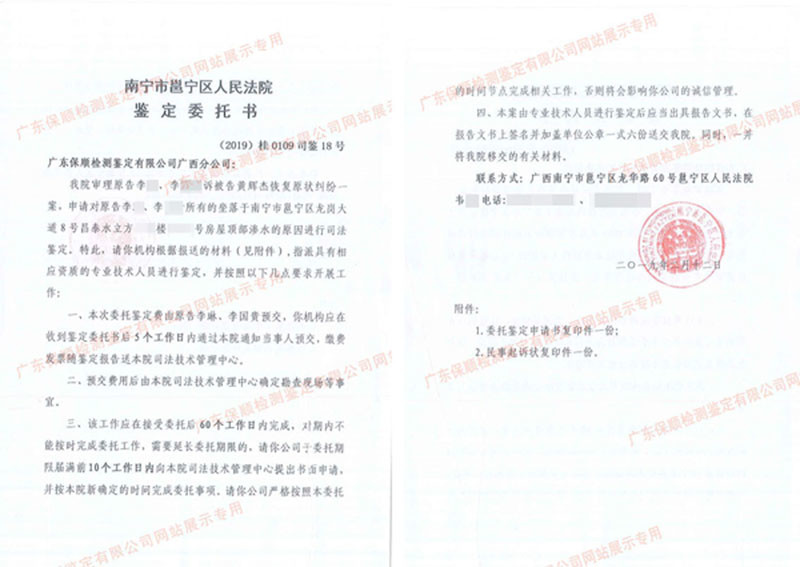 由南寧市邕寧區人民法院審理的原告李X、李XX訴被告黃輝杰恢復原狀糾紛一案,因案情需要,受南寧市邕寧區人民法院的委托,房屋鑒定公司廣東保順檢測鑒定有限公司對位于邕寧區龍崗大道8號昌泰水立方X號樓X室頂部滲水原因進行鑒定。