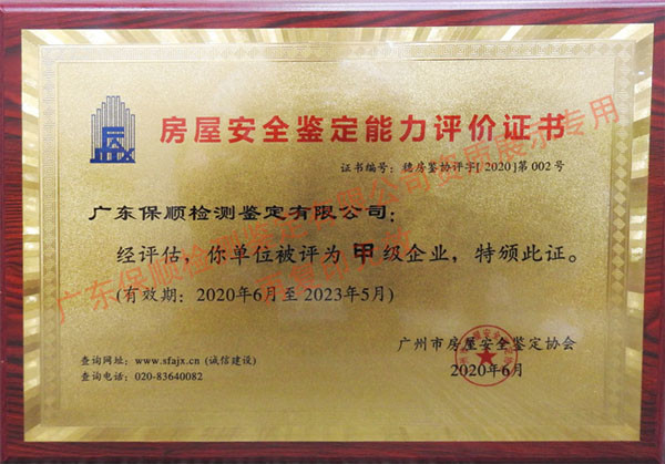 廣東保順檢測鑒定有限公司于2016年被廣東省建設(shè)工程質(zhì)量安全檢測鑒定協(xié)會評為房屋安全鑒定能力甲級企業(yè),本次評定為繼廣東省建設(shè)工程質(zhì)量安全檢測鑒定協(xié)會后被廣州市房屋安全鑒定協(xié)會評為房屋安全鑒定能力甲級企業(yè)。